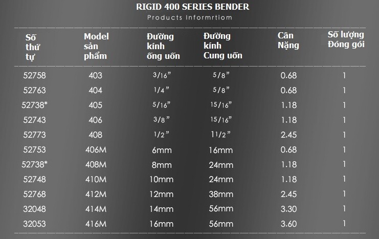 1. Model:Ridgid 404 Dùng uốn ống đường kính 1/4 inch, đường kính cung uống 5/8 inch ( ~ 16mm)