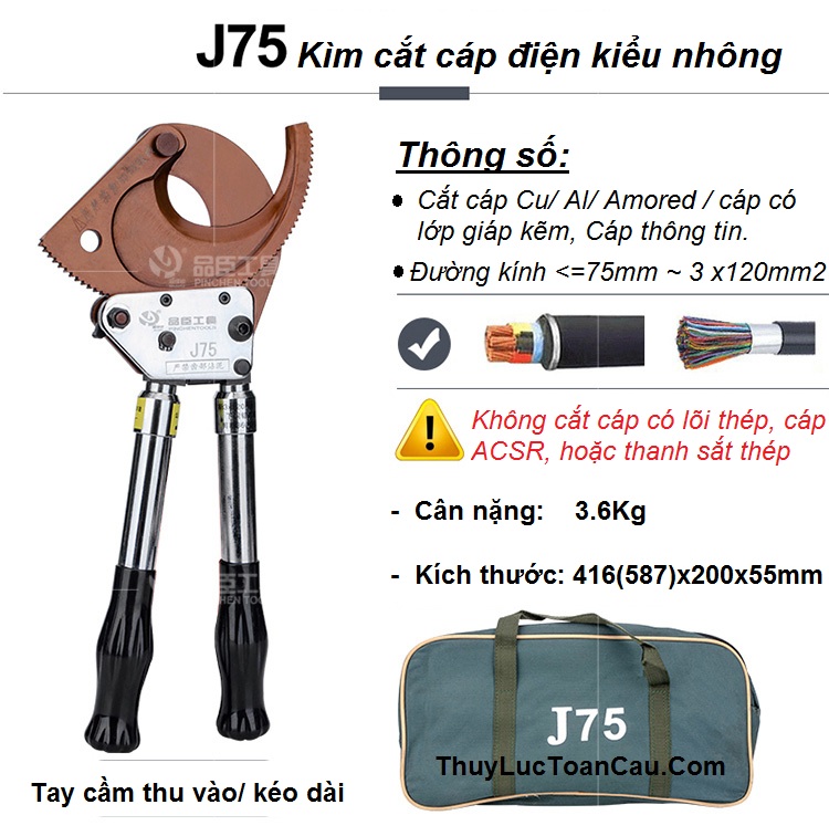 - Khi bạn cần cắt cáp điện ngầm 3 x 120mm2 hoặc cáp có đường Kính 75mm thì Kìm cắt cáp Kiểu Nhông J75 nên là lựa chọn đầu tiên.Bởi những yếu tố sau đây